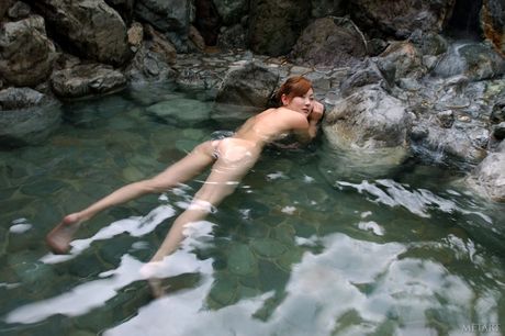 Redheaded Japanese teen Misato A gets naked in a shallow stream