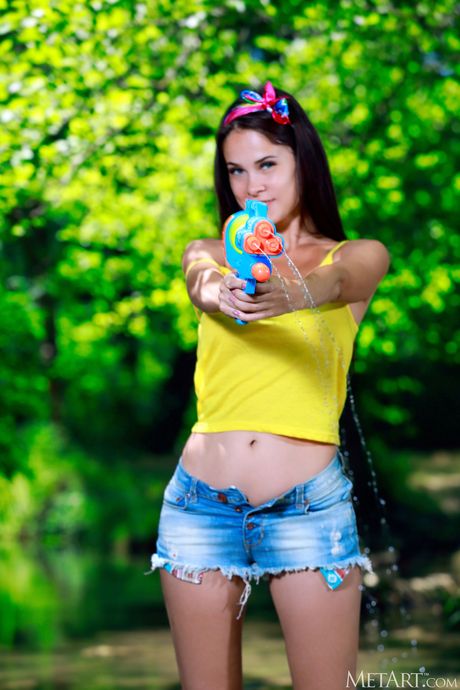 Russian peach Martina Mink gets naked in a water fight on a sandy beach