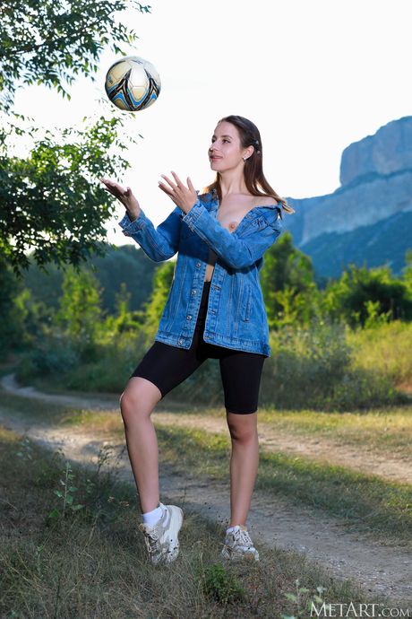 Russian venus Annamalia goes naked while playing soccer in a meadow