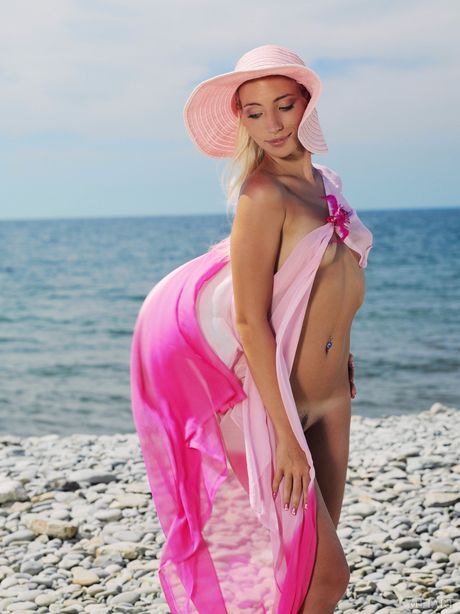 Sexy blonde Adele B reveals her big tits and poses nude on the beach