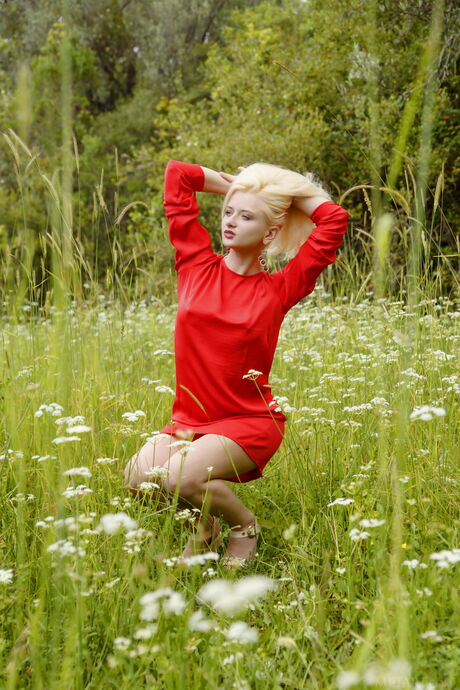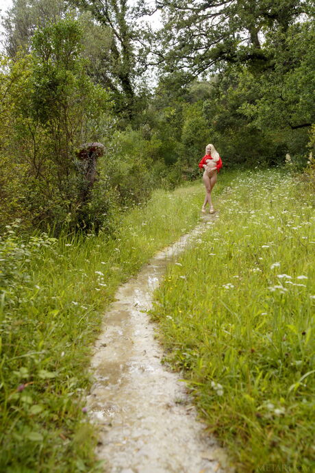 Sexy blonde Nika N strips naked in a tree & poses in the forest