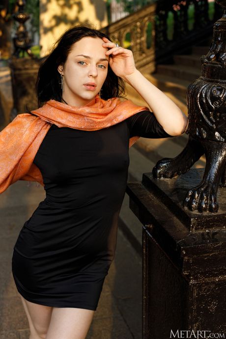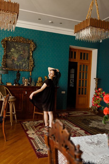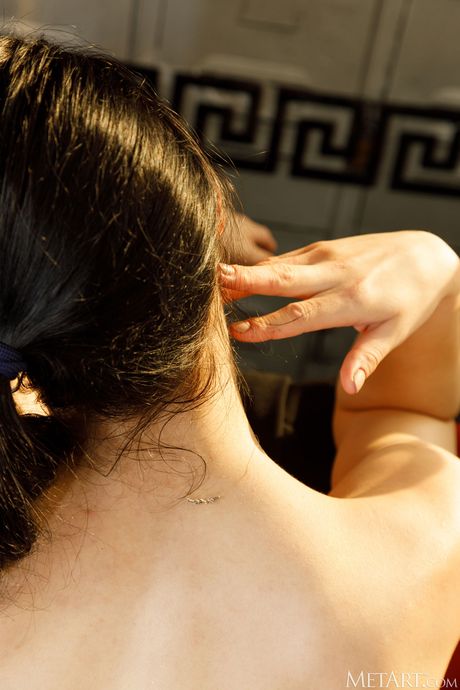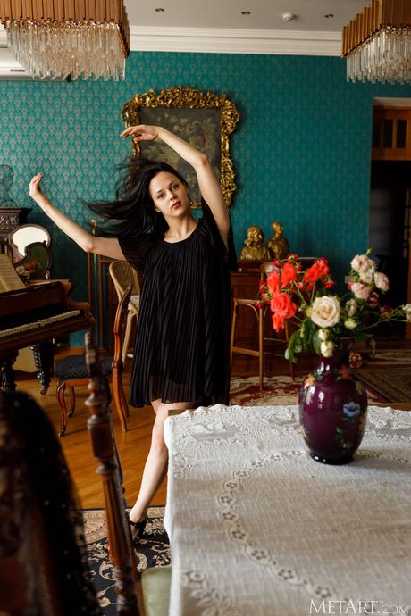 Sexy brunette Nikta strips her black stockings and poses naked in the office