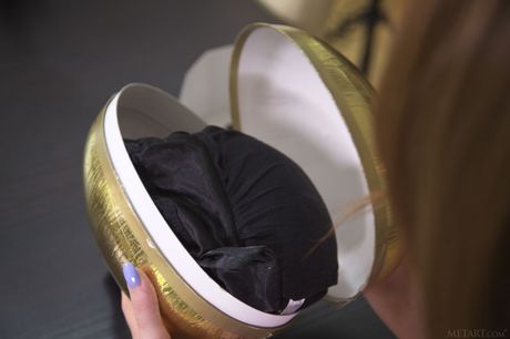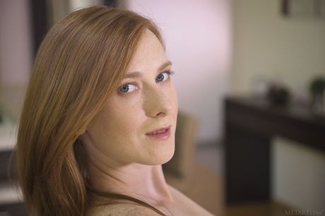 Sexy redhead Linda Sweet removes a black dress and crotchless pantyhose to