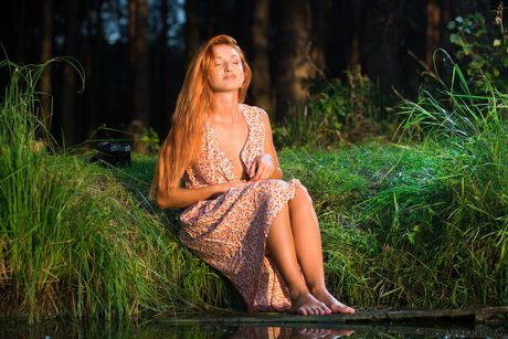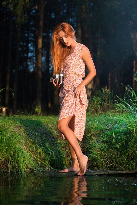 Sexy redhead Michelle H removes her dress and thong to pose nude in nature
