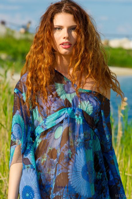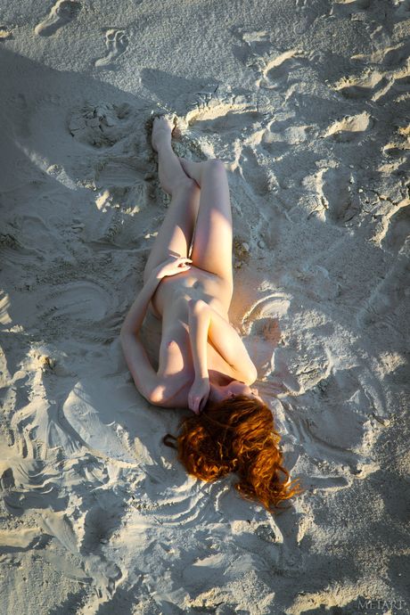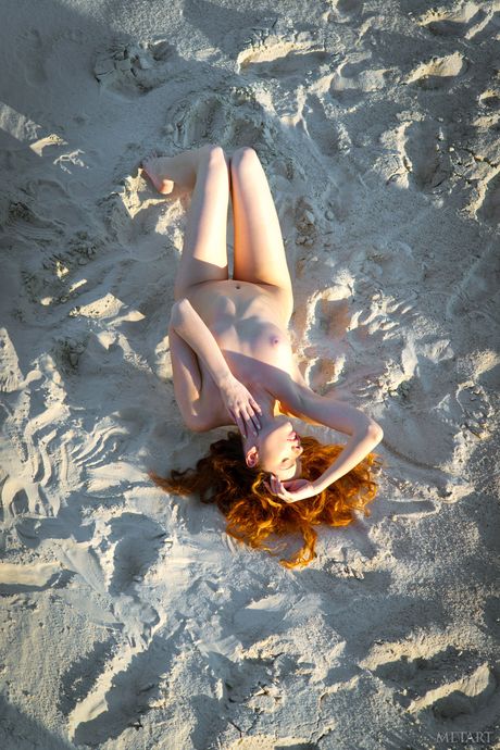 Sexy redhead Sara D removes her bikini to pose nude on a rocky beach