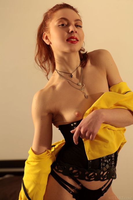 Sexy redhead Valery Leche removes a corset and boots to get naked