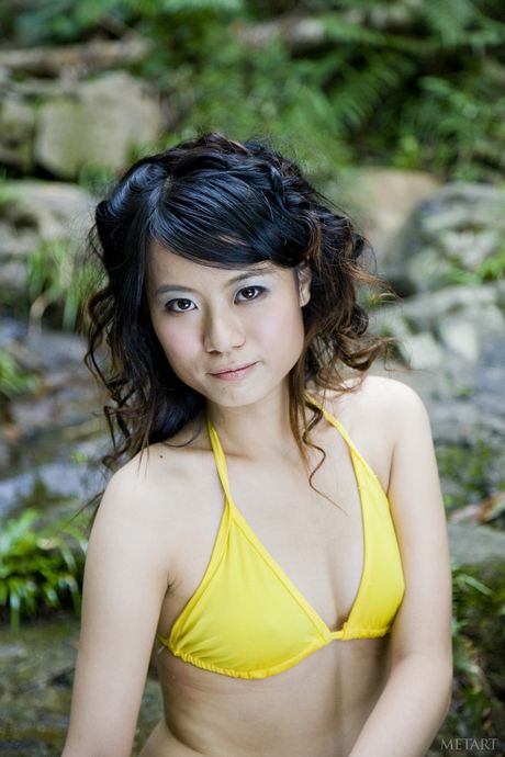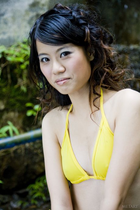 Skinny Asian babe Coie Cheung strips her bikini & poses nude in the garden