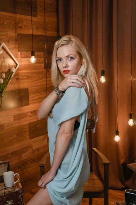 Skinny blonde Camelia removes her red lipstick and lingerie to pose nude