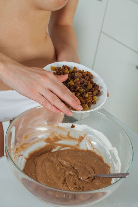 Skinny blonde Charmane removes her bikini and spreads her pussy in the kitchen
