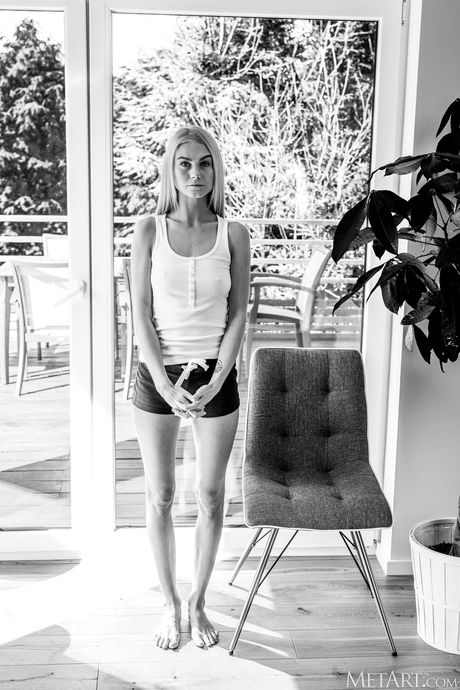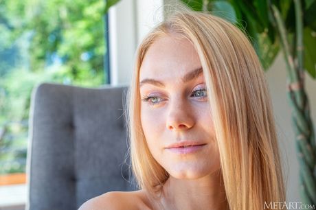 Skinny blonde teen Nancy A gets naked and exhibits her big tits and twat