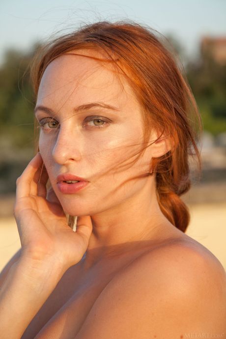 Skinny redhead Sally A strips naked outdoors & shows her hairy pussy