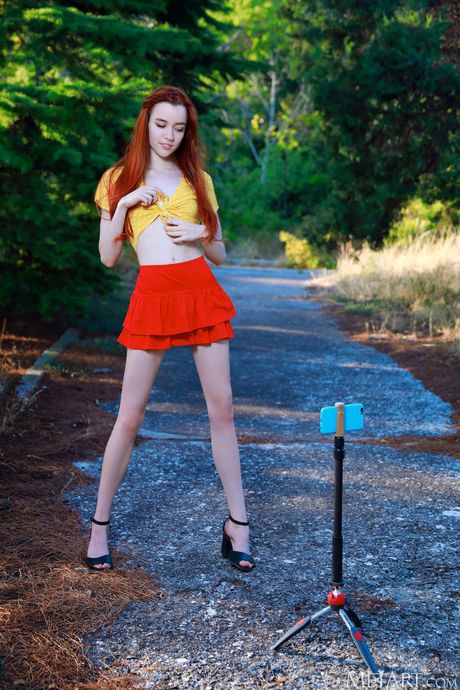 Skinny redhead Sherice takes selfies while getting naked in the forest