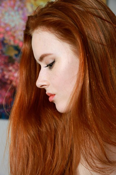 Skinny redheaded teen Bella Milano removes her lingerie and poses nude
