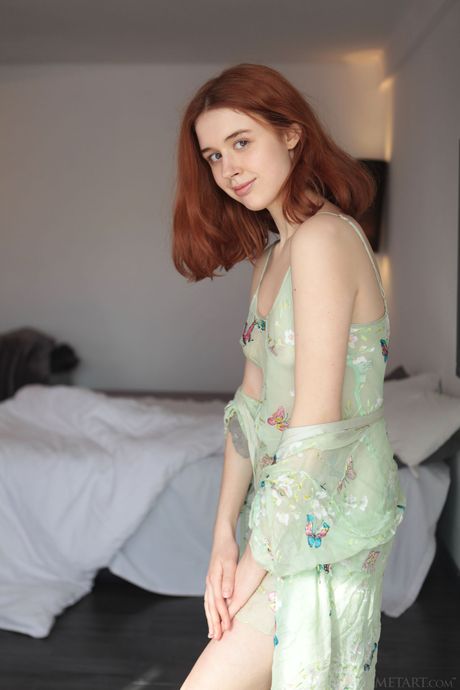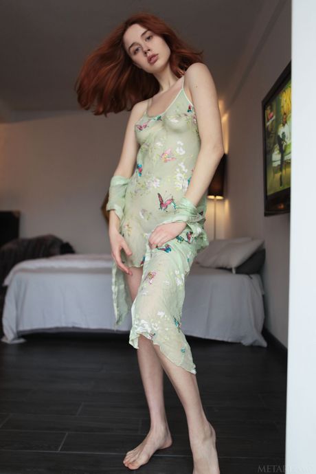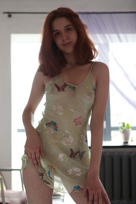 Skinny redheaded teen Riccarda strips naked and poses in the kitchen
