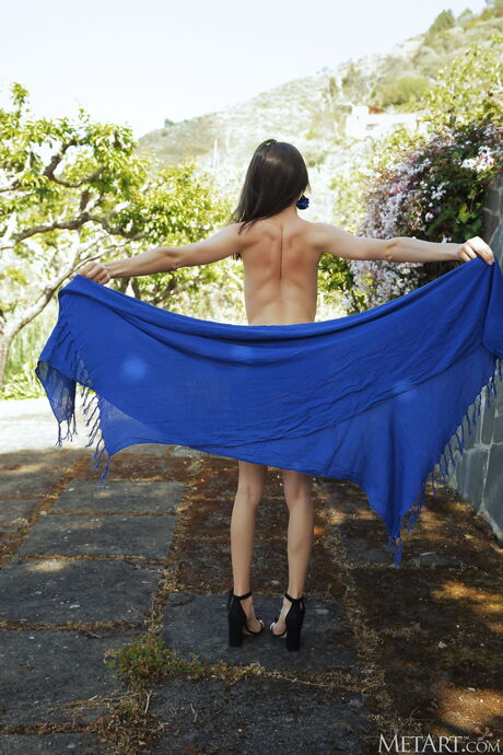 Skinny teen Adel Morel shows her small tits & shaved pussy in the garden