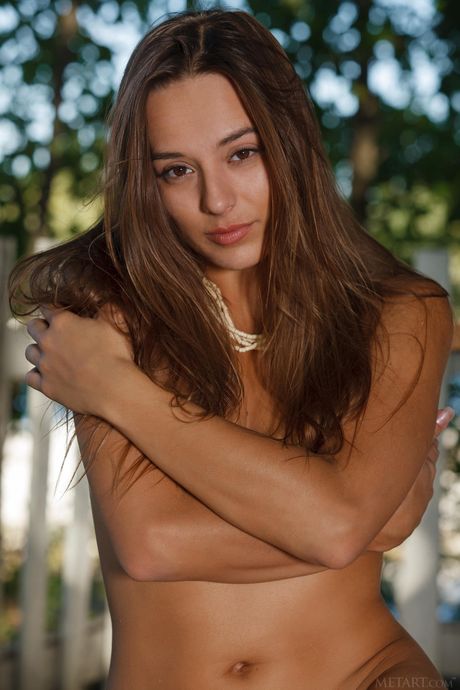 Skinny teen Dominika A shows her small tits and poses nude on a patio