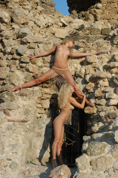 Skinny teens Inna A & Olya E pose nude in a secluded spot by the sea