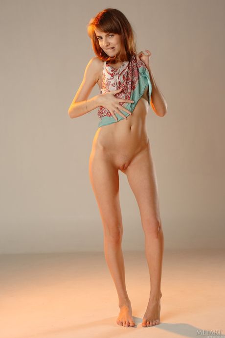 Slender teen Martha A gets naked and presents her tiny tits and shaved pussy