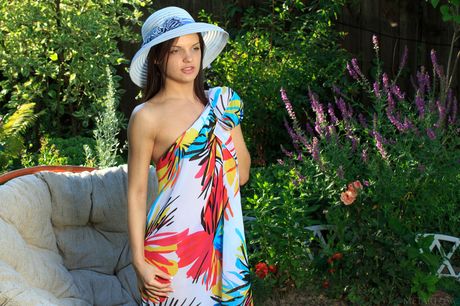 Slender teen Vikki Mauri displays her big tits and poses naked