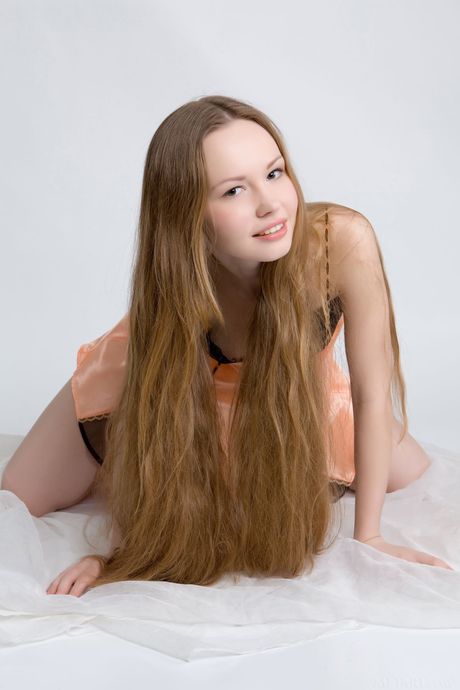 Slender teen Virginia Sun removes her lingerie and displays her tiny tits and twat