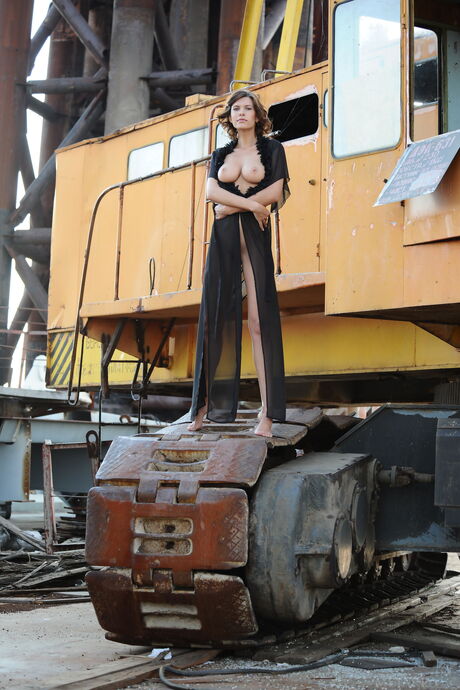 Solo girl Suzanna A removes a robe to pose nude on a metal staircase