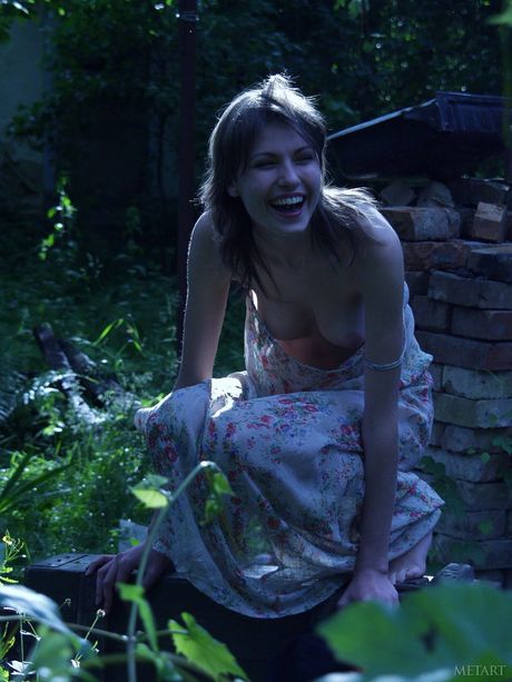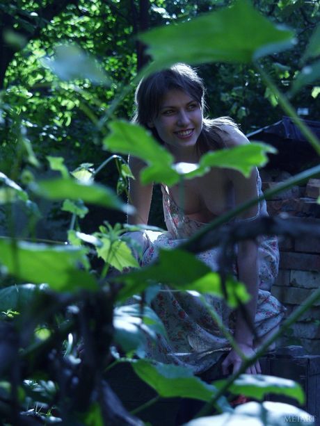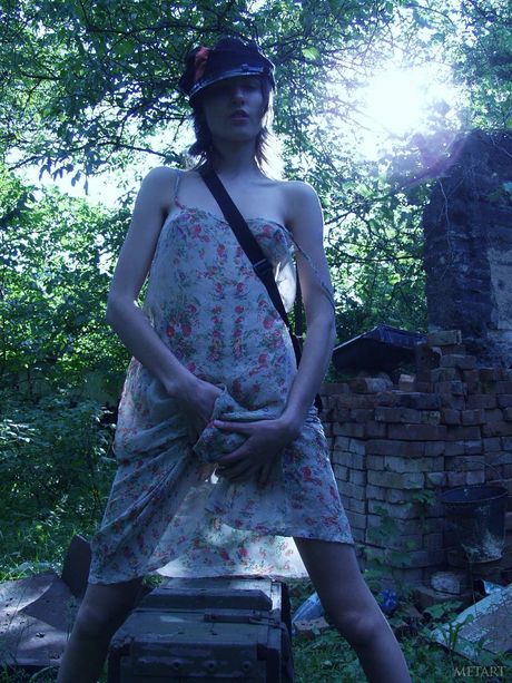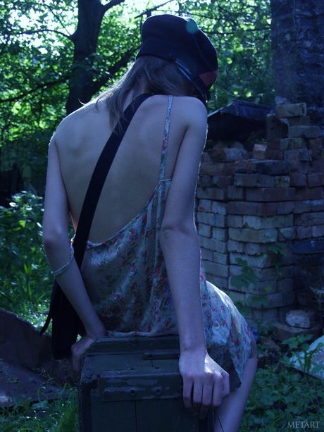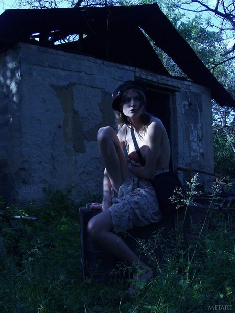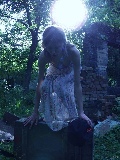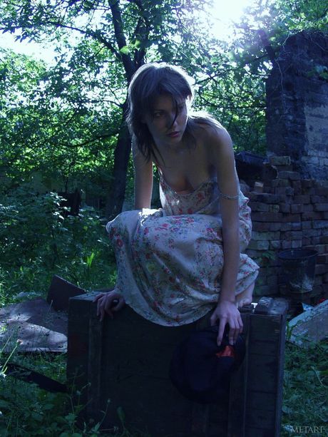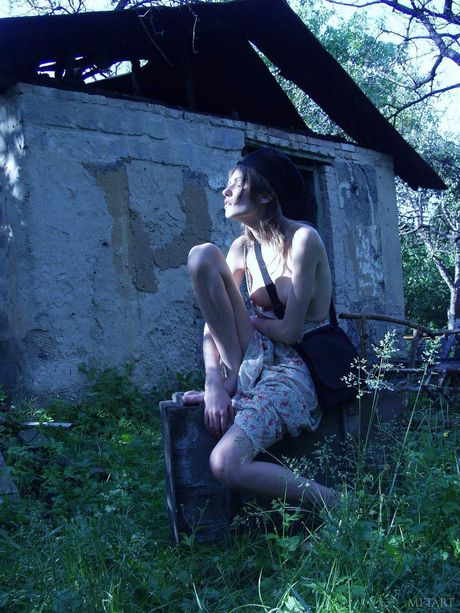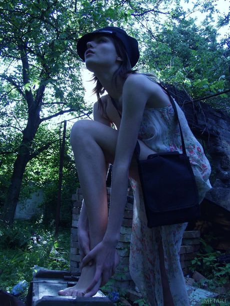 Solo girl with long hair and a hat poses nude in a field of wildflowers