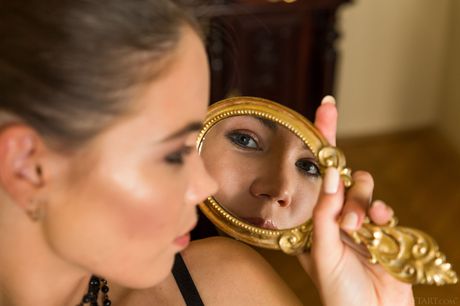 Svelte teen Lovenia Lux removes her lingerie and stockings to get naked