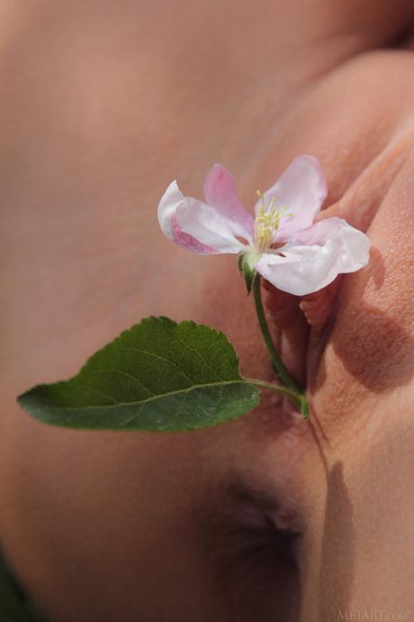 Svelte teen Mango A flaunting her big tits and shaved pussy outdoors