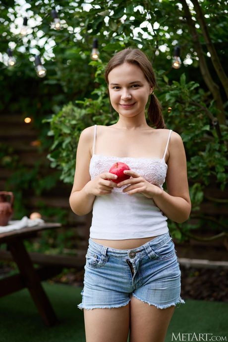 Svelte teen Yenn Cat bares it all on a bench in a garden