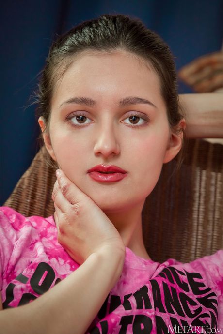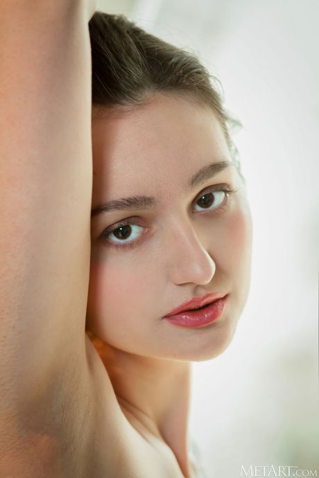 Sweet teen Adeline removes her clothes and socks to model in the nude