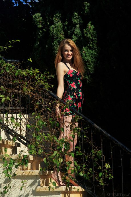 Tall teen Alice May removes a dress to pose nude on a set of stairs
