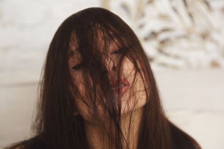 Tempting teen Astrid Herrara removes her lingerie & flaunts her big tits & holes