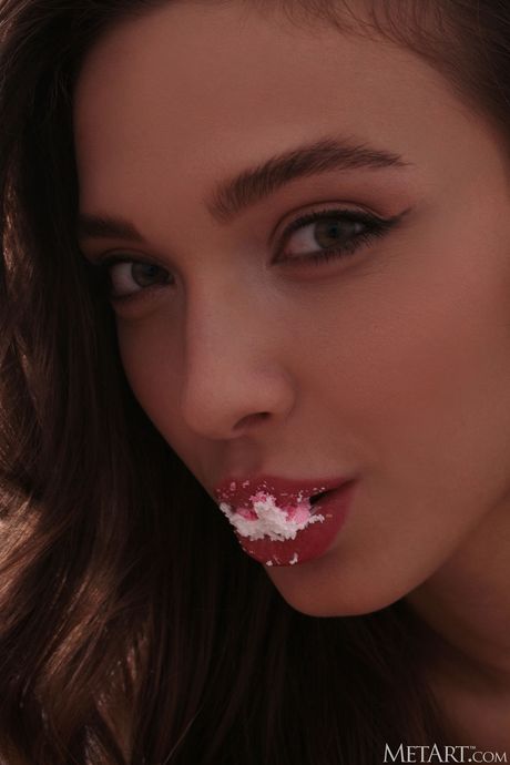 Tender teen Santa removes her lingerie before applying whipped cream on her body