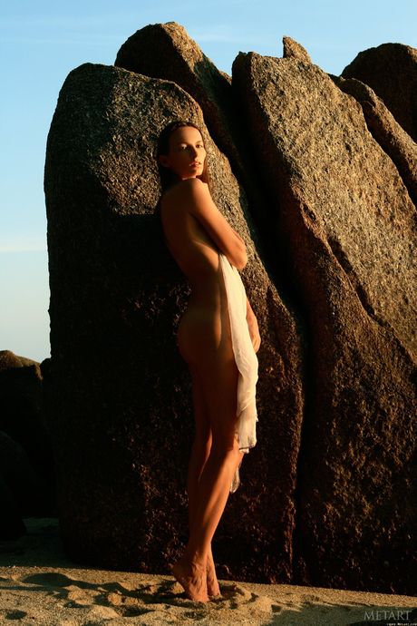 Thin teen Nadya C removes her bikini to pose nude on a beach