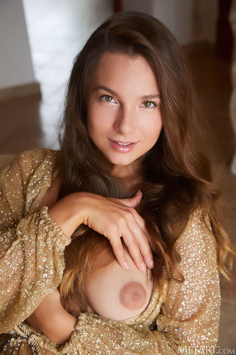 Ukrainian beauty Belka removes a gold dress to model in the nude