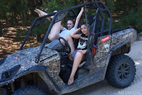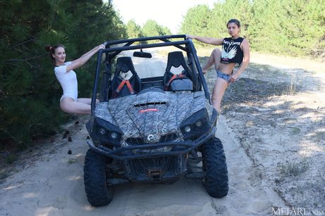 Ukrainian erotic model Nora Roam and her girlfriend pose nude on a buggy