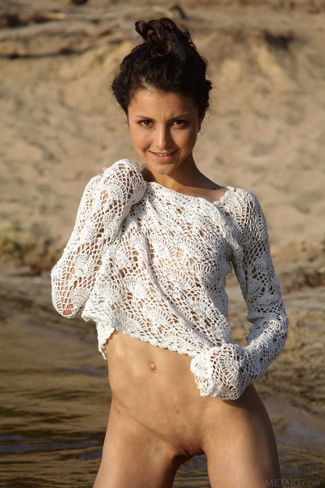 Ukrainian lady Divina A shows her big tits and poses naked on the beach