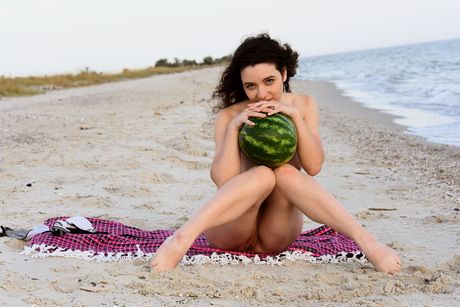 Ukrainian model Yennefer gets naked on a beach while eating a watermelon