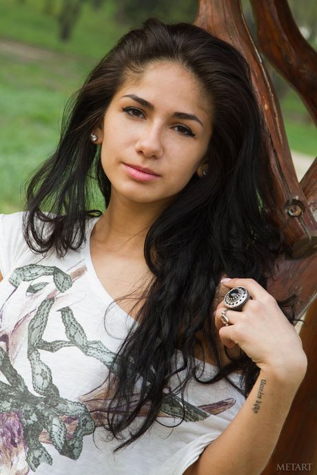 Ukrainian peach Malina A exhibits her small tits and twat on a bench