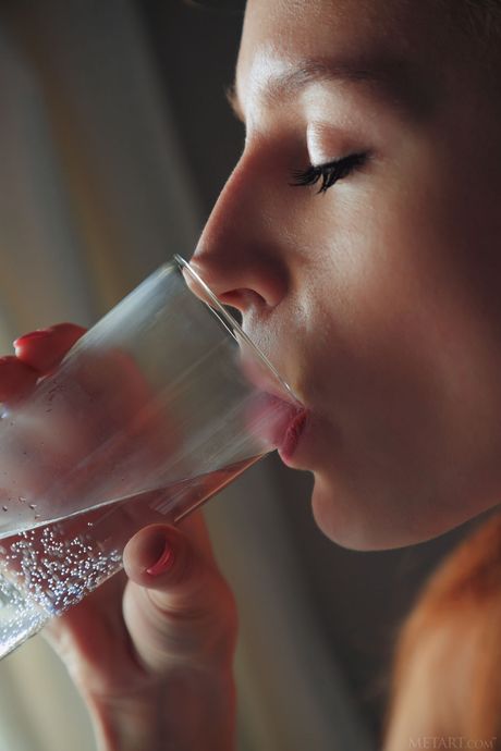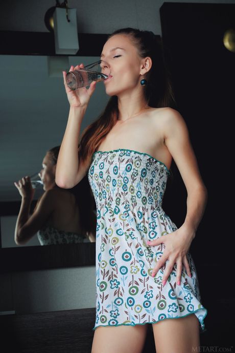 Winsome teen Sofi Shane removes a short dress to get totally naked on a stool