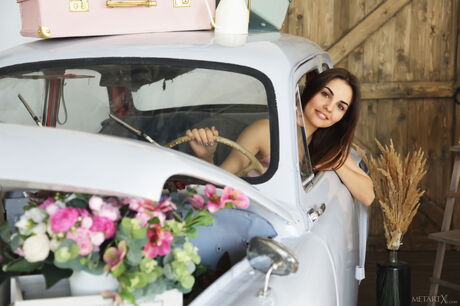 Beautiful teen Alise Moreno takes off everything on a vintage car and fingers her pussy
