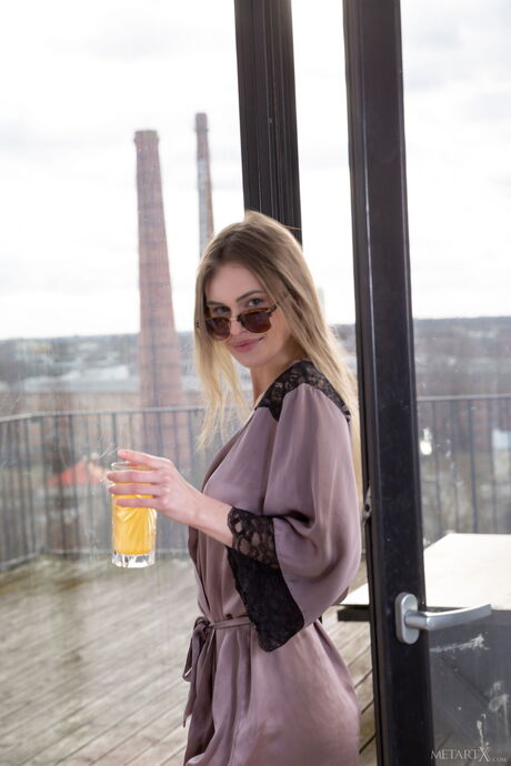 Blonde teen Ruth removes her glasses before fingering her pussy on a patio