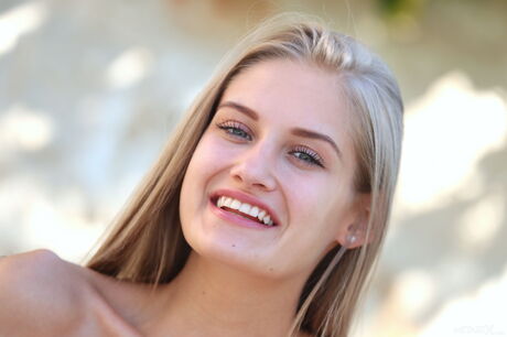 Blonde teen Tiffany Tatum fingers her pussy after getting naked in the yard