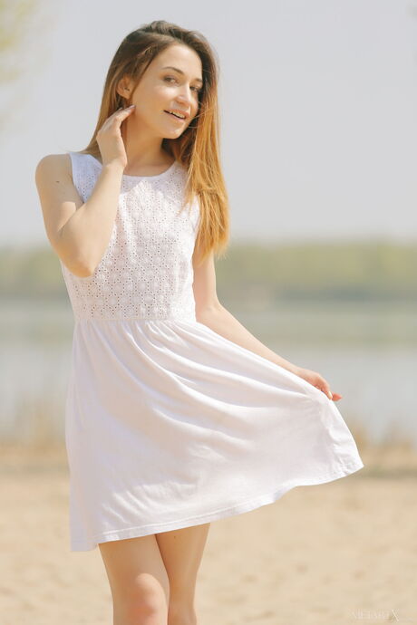 Charming teen Susie removes her bikini before fingering her pussy on a bed