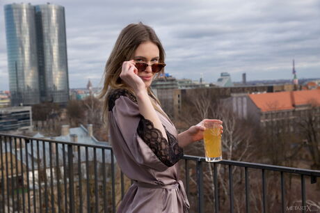 Cute teen Ruth gets naked on a balcony before toying her pussy in a solo