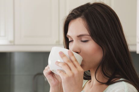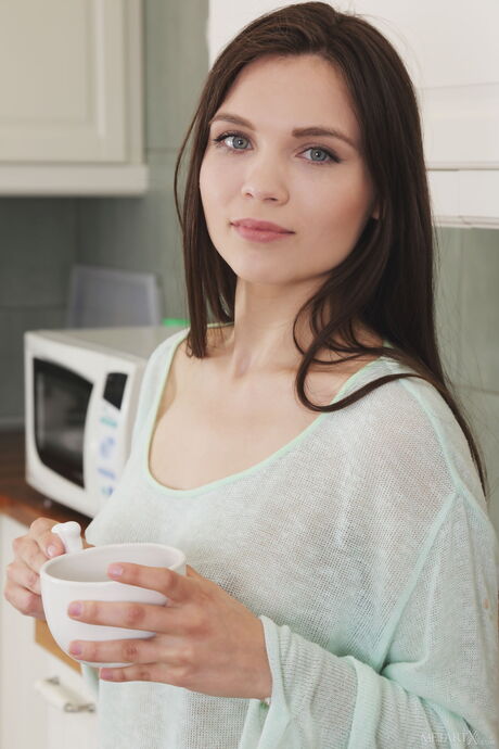 Gorgeous teen Adriana Fawn fingers her pussy while sipping tea in the nude