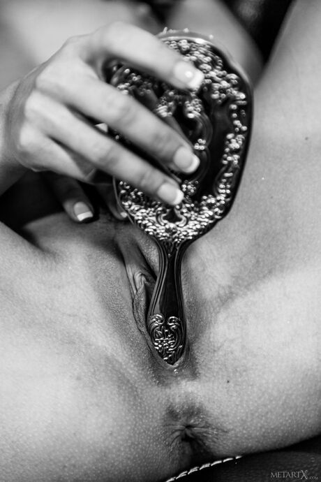 Lean teen Sapphira A rubs her pussy with a hairbrush after getting naked