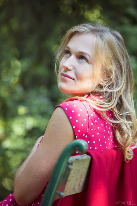 Lovely teen Aislin removes her bikini before fingering her pussy on a bench