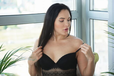 Russian brunette Black Fox strips and fingers her pussy in a chair
