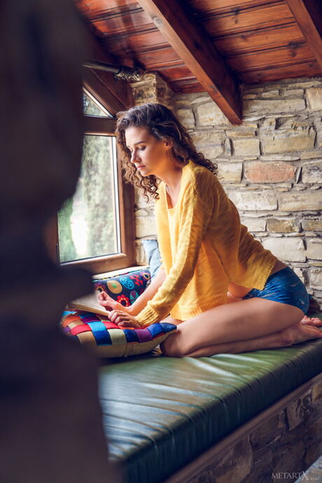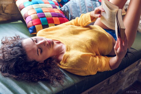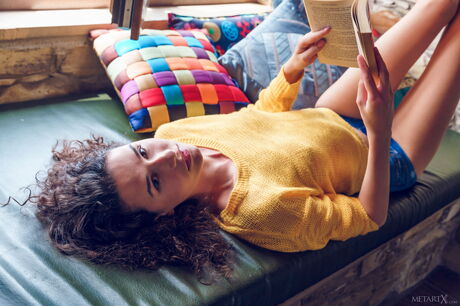 Stunning teen Cristin fingers her pussy after getting naked on a bed